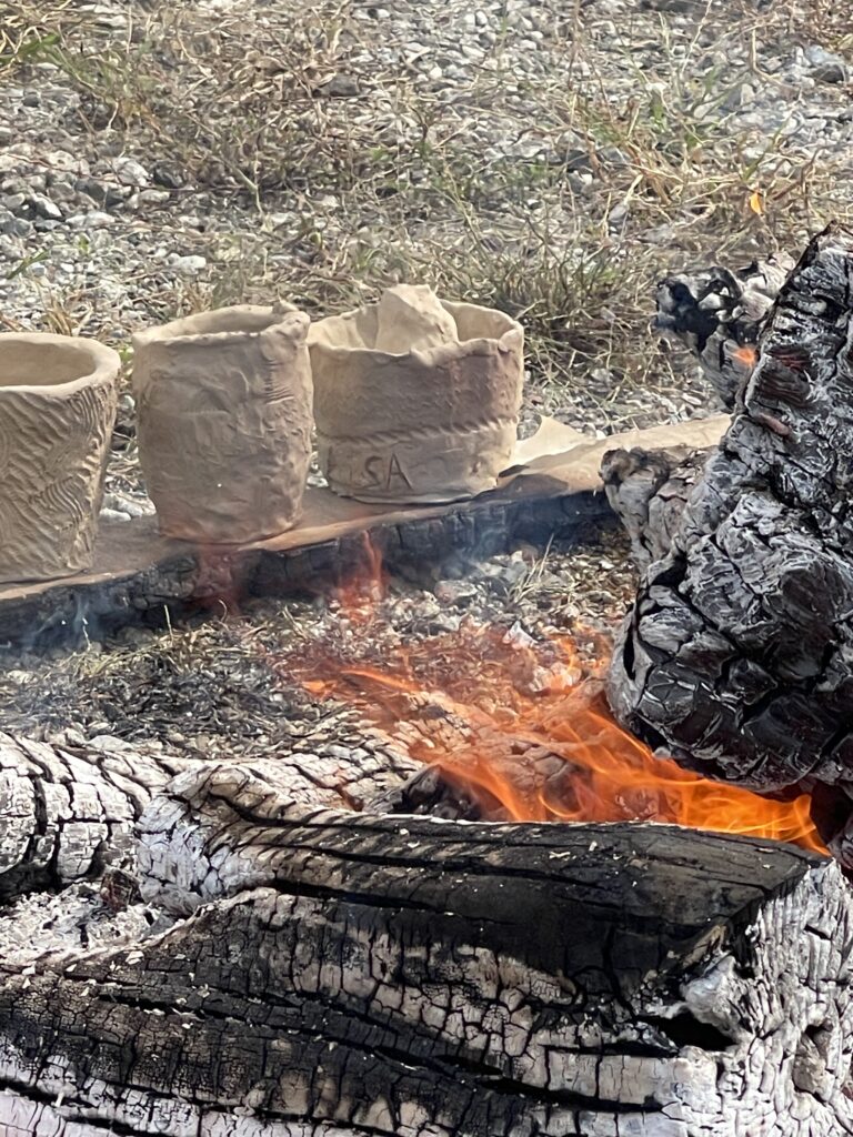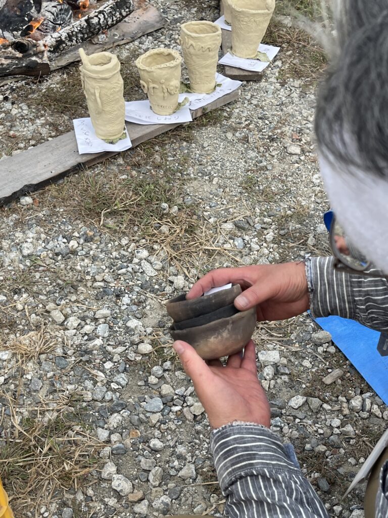 この土器は、7月末の親子体験や歴史クラブで子どもたちが作ったものを約2か月間ひかげ干ししたものです。